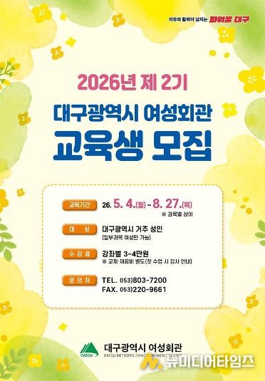 대구광역시 여성회관은 시민들의 자기계발을 돕고 평생학습 기회를 확대하기 위해 4월 6일부터 ‘2026년 제2기 교육생’을 모집한다.