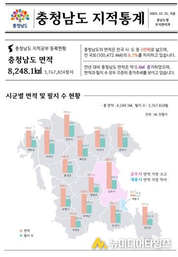 충남도는 ‘2026년 지적통계*’ 분석 결과, 도의 전체 토지 면적이 전년 대비 0.4㎢가량 늘어난 8248.1㎢(376만 7824필지)로 집계됐고 도내 생활·교통·산업 기반 시설 면적이 증가했다고 5일 밝혔다.