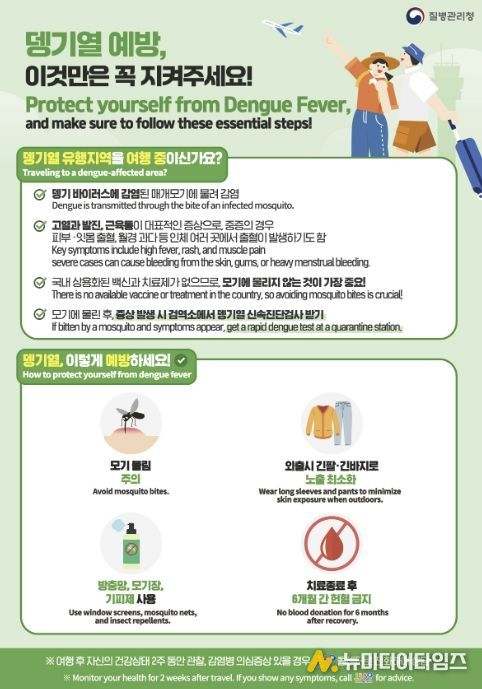 보건소는 해외 방문 후 2주 이내 뎅기열 의심 증상(발열, 두통, 발진 등)이 있는 경우 주소지와 관계없이 누구나 무료 확진 검사를 받을 수 있다고 설명했다.