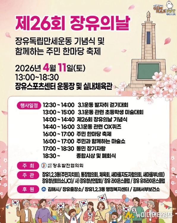 조승욱 장유출장소장은 “장유의 대표 행사인 장유의 날 행사를 통해 독립만세운동의 숭고한 정신을 되새기고, 주민 모두가 하나되는 화합의 장이 되길 바란다”며 “많은 시민들의 관심과 참여를 부탁드린다”고 밝혔다.