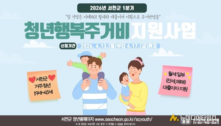 서천군이 오는 13일부터 17일까지 2026년 1분기 청년 행복주거비 신청을 받는다.