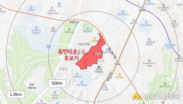 다산동 일대(신당동 432-24번지) 약 51,448㎡는 남산 고도지구 완화 이후 서울시 공모사업인 '휴먼타운 2.0' 후보지로 선정된 지역이다. 최대 100억 원 규모의 시비를 지원받아 대규모 재개발이 어려운 저층주거지를 대상으로 주택정비 지원과 생활기반시설 확충을 병행하는 방식의 주거환경 개선 사업이 추진된다. 현재는 후보지 단계로, 사업계획(안)에 대해 서울시와 협의를 거쳐, 사업계획 고시 이후 사업을 본격적으로 추진할 예정이다.