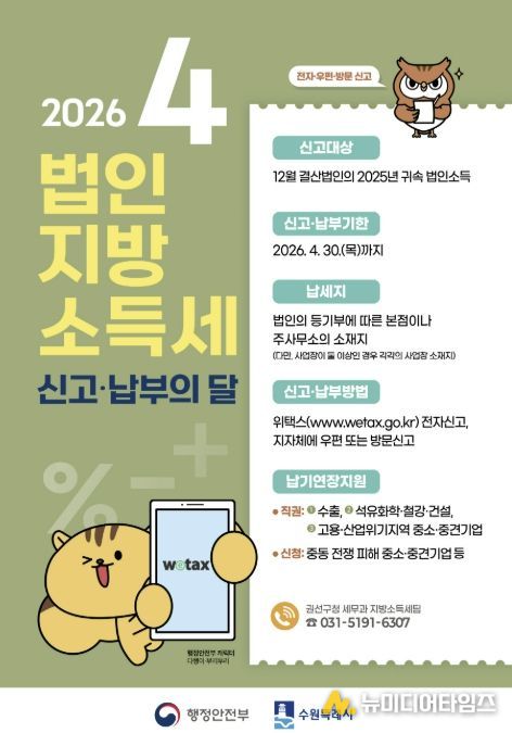 수원시 권선구는 4월 30일까지 관내에 사업장을 두고 있는 법인을 대상으로 법인지방소득세 신고·납부 기간을 운영한다.