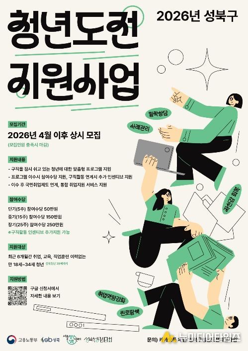 성북구가 고용노동부 주관 공모사업에 선정돼 구직단념 청년 등의 사회 복귀를 지원하는 ‘2026 청년도전지원사업’ 참여자를 모집한다.