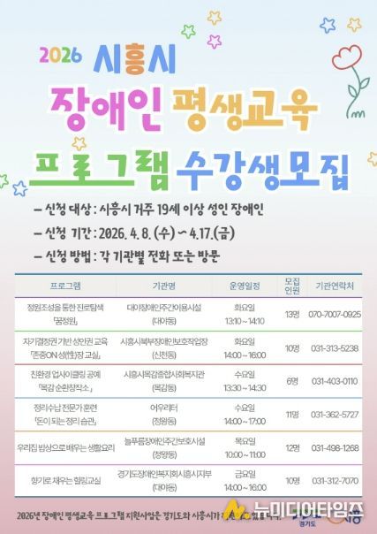 시흥시가 관내 성인 장애인의 학습권 보장과 사회참여 확대를 위해 ‘2026년 장애인 평생교육 프로그램 지원사업’을 본격적으로 시작하며, 4월 8일부터 17일까지 프로그램 운영을 위한 학습자를 모집한다.