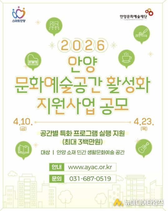 안양문화예술재단은 지역 내 민간 생활문화예술 공간의 자립 기반을 강화하고 문화시민을 육성하기 위한 '2026 문화예술공간 활성화 지원사업' 참여 공간을 공개 모집한다고 8일 밝혔다.