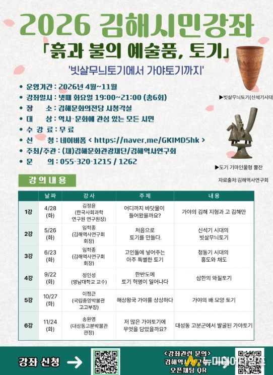 올해 강좌의 주제는 ‘흙과 불의 만남–토기’로, 빗살무늬토기에서 가야토기까지 토기의 역사와 의미를 살펴볼 예정이다. 우리 지역 역사에 관심 있는 시민이라면 누구나 참여할 수 있으며, 자신의 일정과 관심 분야에 맞춰 자유롭게 수강할 수 있다.