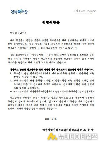 대전 소재 식재료 공급업체를 대상으로 발송한 교육장 청렴 서한문에는 학교급식 관련 공직자에게 금품이나 향응 또는 선물 등을 제공할 수 없음을 명시했다. 또한 관련 공직자가 이를 요구할 경우 대전시교육청 누리집 내 부조리 신고센터로 신고할 수 있도록 안내했다.