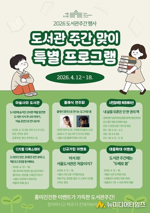 이와 함께 이번 도서관주간 동안 서울도서관뿐 아니라 25개 자치구의 공공도서관에서도 지역 주민들을 위한 다채로운 독서문화프로그램이 펼쳐진다. 작은 펼침 큰 열림(성북구), 취학 전 1000권 읽기 상반기 어린이 축제(중랑구), 케데헌에서 발견하는 한국의 사유들(노원구) 등 다양한 행사가 일제히 진행돼 서울 전역이 책 읽는 축제의 장이 될 전망이다. 자치구별 도서관주간 상세 프로그램은 각 도서관 누리집을 통해 확인할 수 있다.