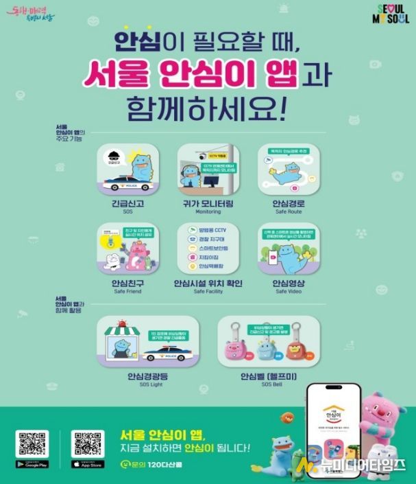 이 밖에도 안심이앱에는 폐쇄회로 텔레비전(CCTV)과 경찰관서 등 안전시설이 많은 경로를 안내하는 ‘안심경로’, 보호자나 지인과 위치를 공유하는 ‘안심친구’, 안심시설 위치 정보를 제공하는 ‘안심지도’ 기능 등이 마련돼 있다.