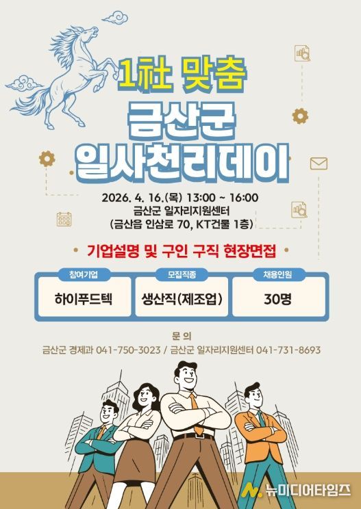 금산군은 오는 16일 오후 1시부터 4시까지 금산읍 케이티KT) 건물 소재 금산일자리지원센터에서 1사(社) 맞춤 일사천리데이 현장 면접을 개최한다.