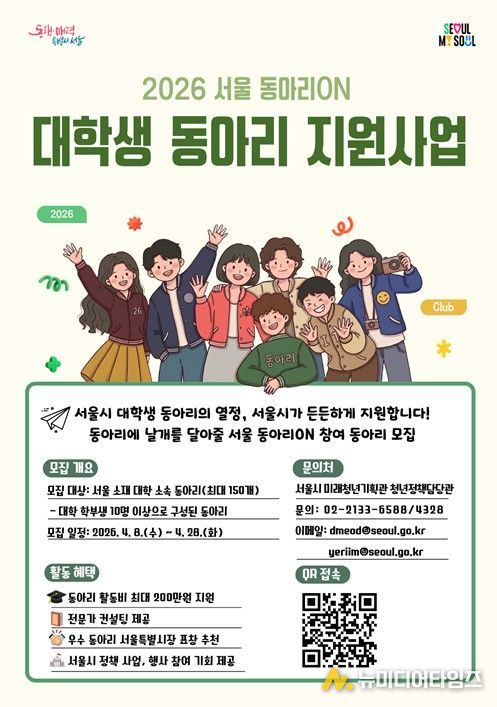 서울시는 4월 8일부터 28일까지 ‘대학생 동아리 지원(서울 동아리 ON)’ 사업에 참여할 서울 소재 대학 동아리 150개를 모집한다고 밝혔다.