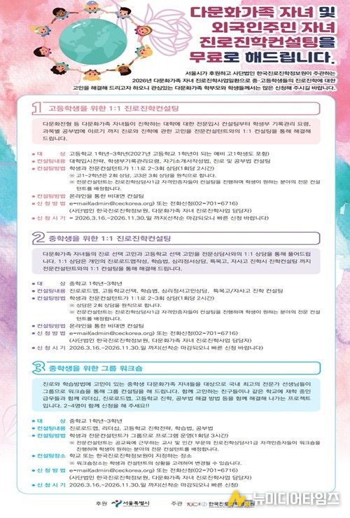 서울시는 부모 또는 학생 본인이 외국 국적이거나 외국 국적을 가진 적이 있는 학생을 의미하는 이주배경 청소년들을 위한 진로 설계와 대학 진학을 지원하는'다문화가족 자녀 진로·진학 지원사업'을 올해 확대 추진한다고 밝혔다. 본 사업은 2014년부터 시작되어 12년간 운영된 서울시 대표 다문화 청소년 지원사업으로, 올해부터 축적된 상담 데이터를 기반으로 개인별 진로경로 설계(ICP, Individual Career Pathway)를 도입한다.