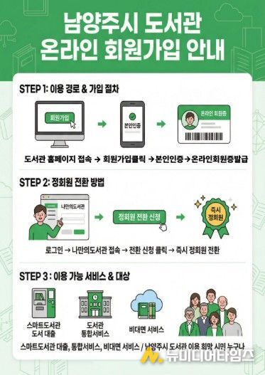 남양주시는 도서관 방문 없이 정회원 가입이 가능한 온라인 회원가입 서비스를 8일에 개시한다고 밝혔다.