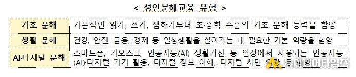 성인 문해교육 지원사업은 배움의 기회를 놓친 어르신 등에게 읽기·쓰기·셈하기 등 기초 문해 역량부터 건강, 안전, 금융 등 일상생활에 필요한 역량, 나아가 인공지능(AI)·디지털 활용 역량까지 함양할 수 있도록 지원하는 사업이다.