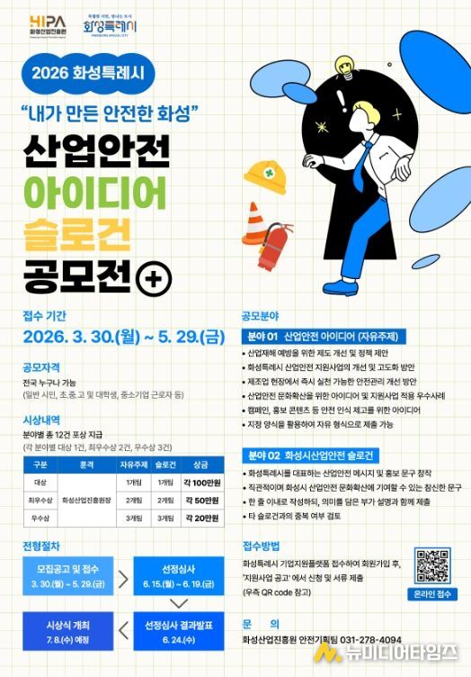 전병선 화성산업진흥원장은 “이번 공모전을 통해 산업현장에서 실제 활용 가능한 아이디어를 발굴하고, 시민과 기업이 함께 참여하는 안전문화가 현장에 정착될 수 있기를 기대한다”며 “참신한 제안이 정책으로 이어질 수 있도록 적극 검토해 나가겠다”고 밝혔다.