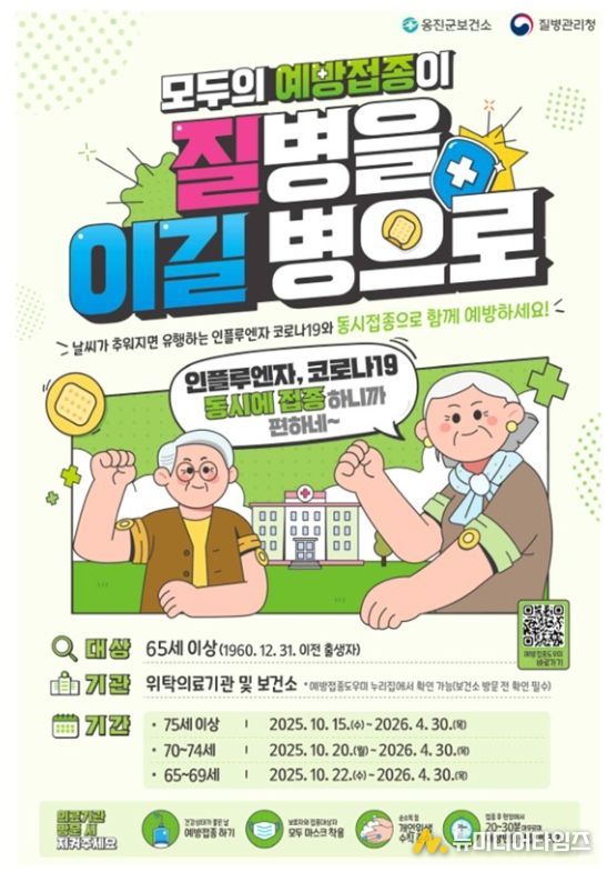 박혜련 옹진군보건소장은 “어린이, 임신부, 어르신은 인플루엔자 감염 시, 폐렴 등 합병증 위험이 상대적으로 높아 예방접종을 권장한다”며, “호흡기 감염병 예방을 위해 증상이 있으면 마스크 착용, 올바른 손 씻기, 기침 예절 등을 준수해 줄 것”을 당부했다.