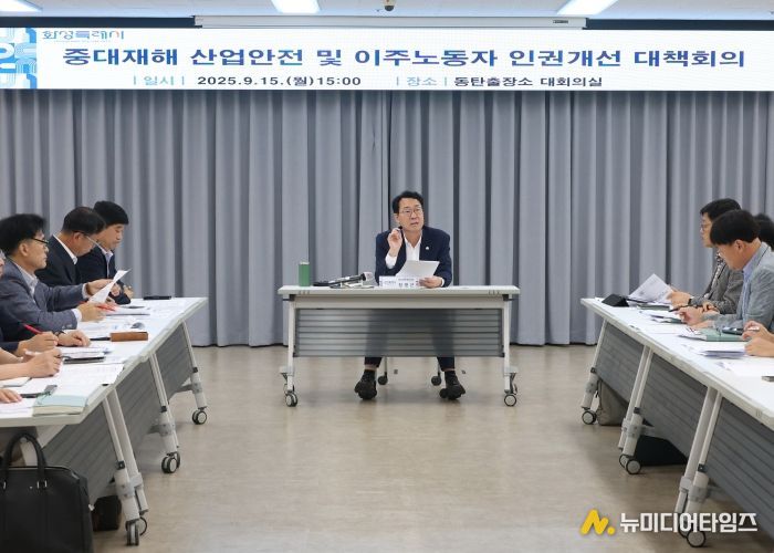 정명근 화성특례시장은 15일 동탄출장소 대회의실에서 ‘중대재해 산업안전 및 이주노동자 인권개선 대책 회의’를 열고 안전하고 공정한 노동 환경 조성을 위한 방안을 논의했다.