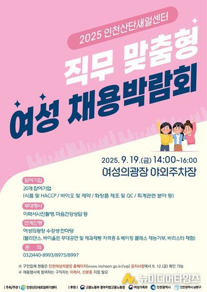 인천광역시 여성의광장 인천산단여성새로일하기센터는 오는 9월 19일 오후 1시부터 여성의광장 야외광장에서 ‘2025 인천산단새일센터 직무 맞춤형 여성 채용박람회’를 개최한다고 밝혔다.