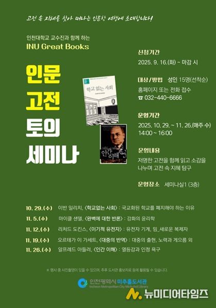 인천광역시 미추홀도서관은 인천대학교 학산도서관과 연계 운영하는 인문고전 토의 세미나. ‘INU Great Books’를 오는 10월 29일부터 11월 26일까지 매주 수요일 오후 2시부터 4시까지, 총 5회에 걸쳐 운영한다고 밝혔다.