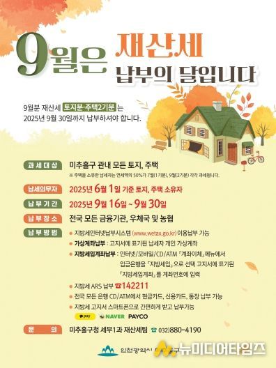 인천 미추홀구는 9월 정기분 재산세(토지분 및 주택 2기분) 518억 원, 21만 2천여 건을 부과했다고 16일 밝혔다.