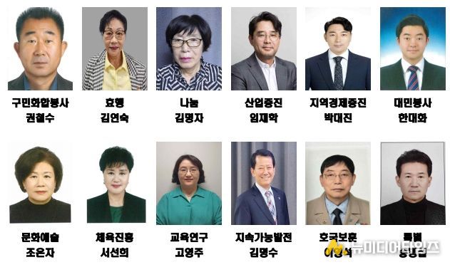 부문별 수상자로는 ▲구민화합봉사 부문 권철수(남, 69세) ▲효행 부문 김연숙(여, 75세) ▲나눔 부문 김명자(여, 66세) ▲산업증진 부문 임재학(남, 51세) ▲지역경제증진 부문 박대진(남, 54세) ▲대민봉사 부문 한대화(남, 34세) ▲문화예술 부문 조은자(여, 63세) ▲체육진흥 부문 서선희(여, 66세) ▲교육연구 부문 고영주(여, 48세) ▲지속가능발전 부문 김명수(남, 67세) ▲호국보훈 부문 이영석(남, 77세) ▲특별 부문 송명섭(남, 61세) 등이다.