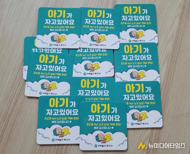 인천 미추홀구보건소는 출산 가정이 휴식과 안전에 대한 배려를 받을 수 있도록 ‘아기가 자고 있어요’ 현관 자석 스티커를 제작해 무료로 배부한다고 17일 밝혔다.
