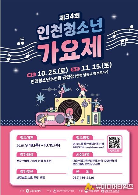 한편, '인천청소년가요제'는 그간 그룹 ‘코요테’의 신지와 가수 김수찬이 청소년 시절 참여해 가수의 꿈을 키운 전통 있는 지역의 대표 청소년 문화 행사로 자리 잡았다.