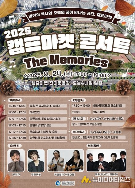 인천광역시는 오는 9월 24일 오후 5시, 부평 캠프마켓 개방공간인 잔디운동장에서 ‘2025 캠프마켓 콘서트 The Memories’를 개최한다고 밝혔다.