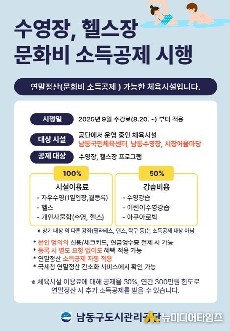 공단은 문화비 소득공제 적용을 위한 결제 시스템 구축 및 승인 절차를 완료하고, 남동국민체육센터, 남동수영장, 서창어울마당 3개 시설에 혜택을 적용한다.