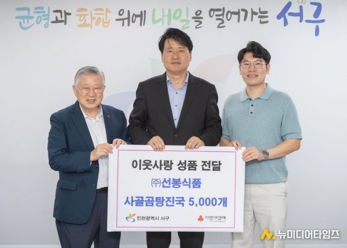 인천 서구는 지난 17일 오류동 소재 식품제조가공업체 ㈜선봉식품(대표 고종국)이 사골곰탕 5,000개(시가 1,400만 원 상당)를 기부했다고 18일 밝혔다.