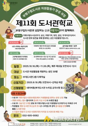 부평구 구립 부개도서관은 18일부터 2025년 부평구립도서관 자원활동가 양성 과정 ‘제11회 도서관학교’ 참가자를 모집한다.