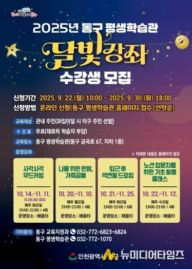 인천 동구는 구민들의 평생학습 참여 기회 확대하기 위하여 야간에 진행하는 ‘달빛강좌’를 개설하고 수강생을 모집한다고 밝혔다.