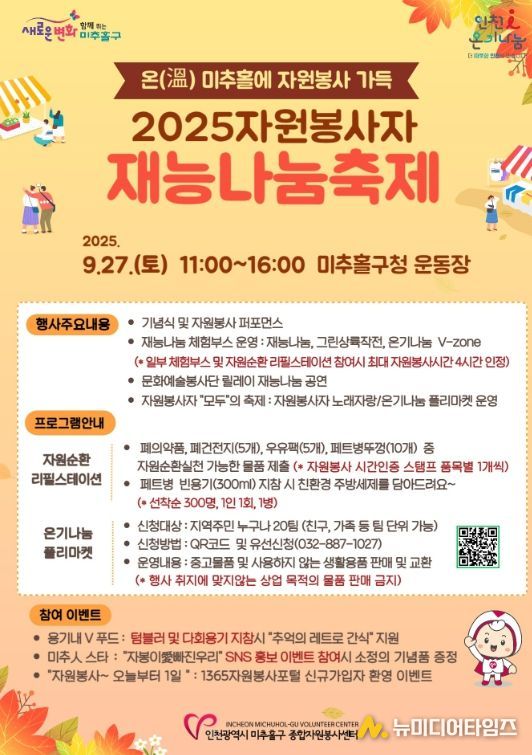 인천 미추홀구종합자원봉사센터는 오는 27일 미추홀구청 운동장에서 ‘온(溫) 미추홀에 자원봉사 가득 - 2025 자원봉사자 재능 나눔 축제’를 개최한다.