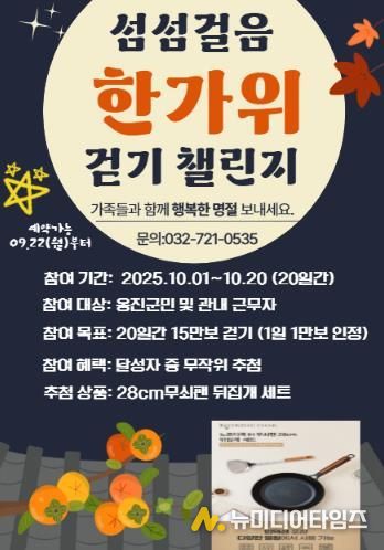 옹진군은 오는 22일부터, 10월 가을철 군민 건강증진과 걷기 실천 확산을 위해 '섬섬걸음 한가위 걷기 챌린지'참가자를 모집한다고 밝혔다.