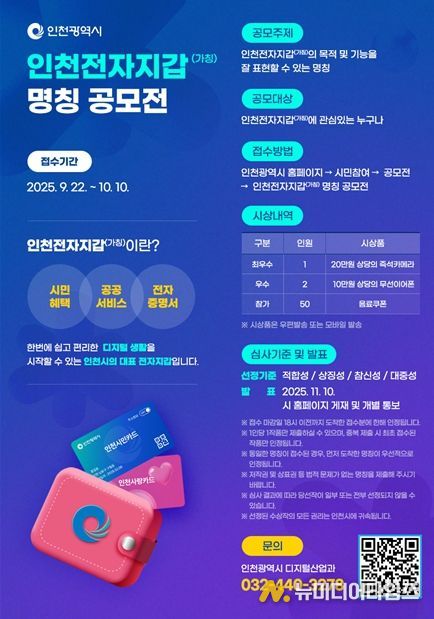인천광역시는 시민들에게 더욱 편리한 디지털 생활을 제공하기 위해 도입하는 블록체인 기반 비대면 공공서비스 앱 ‘인천전자지갑(가칭)’의 명칭 공모전을 9월 22일부터 10월 10일까지 19일간 진행한다고 밝혔다.