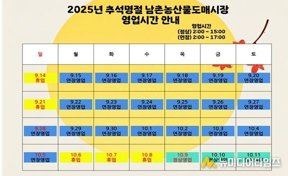 인천광역시 남촌농축산물도매시장관리사무소는 다가오는 추석 명절을 맞아 시민들이 안전하고 편리하게 도매시장을 이용할 수 있도록 종합대책을 마련·추진한다고 밝혔다.