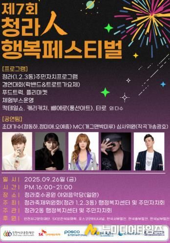 인천 서구 청라2동 행정복지센터는 오는 9월 26일 금요일 오후 4시부터 청라호수공원 야외음악당에서 ‘제7회 청라인 행복 페스티벌’을 개최한다고 22일 밝혔다.