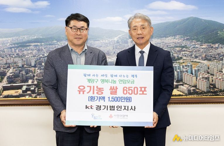 인천광역시 계양구는 지난 22일 KT부천지사에서 지역 내 어려운 이웃을 돕기 위해 유기농 쌀 650포(4kg)를 기탁했다고 밝혔다.