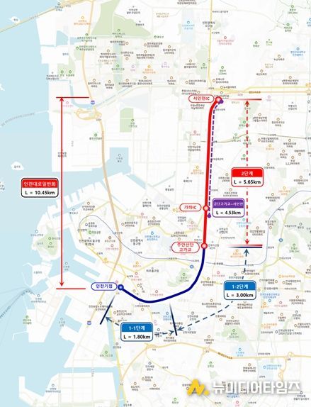 인천광역시는 인천대로 일반화 도로개량공사를 1-1단계인 인천기점~독배로, 1-2단계 독배로~주안산단고가교, 그리고 2단계인 주안산단고가교~서인천IC로 세분화했으며, 오는 10월 2단계 구간을 착공해 전체 사업을 본격적으로 추진한다고 밝혔다.