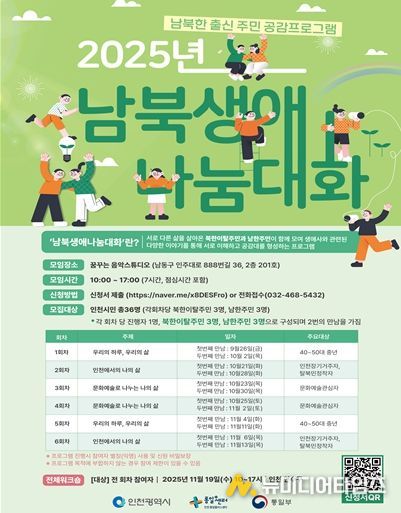 인천광역시는 북한이탈주민과 인천 주민이 서로의 삶을 이야기하며 공감대를 형성하는 시민참여형 프로그램인 ‘남북생애나눔대화’ 를 9월 26일부터 11월 19일까지 진행한다고 밝혔다.