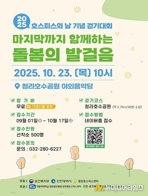 인천광역시는 호스피스·완화의료에 대한 시민들의 이해를 높이고 생명존중 문화를 확산하기 위해 오는 10월 23일 오전 10시, 청라호수공원에서 ‘2025년 호스피스의 날 기념 걷기대회’를 개최한다고 밝혔다.