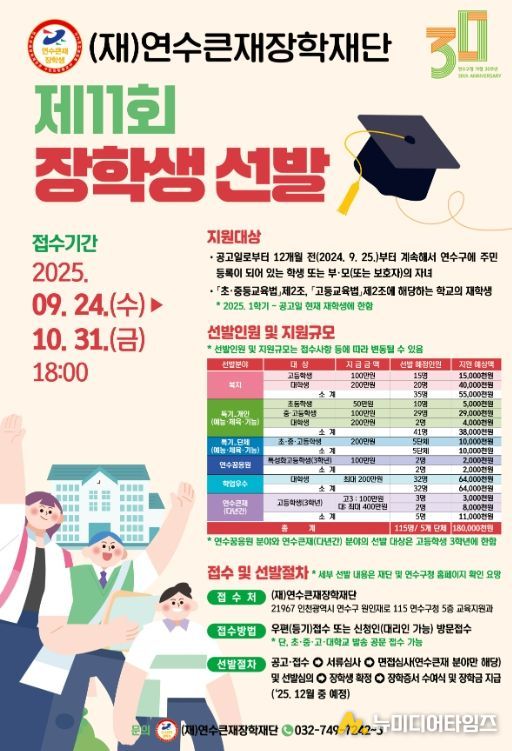 (재)연수큰재장학재단은 미래 지역사회를 이끌어 갈 우수 인재 발굴과 양성을 위해 제11회 장학생을 선발한다.