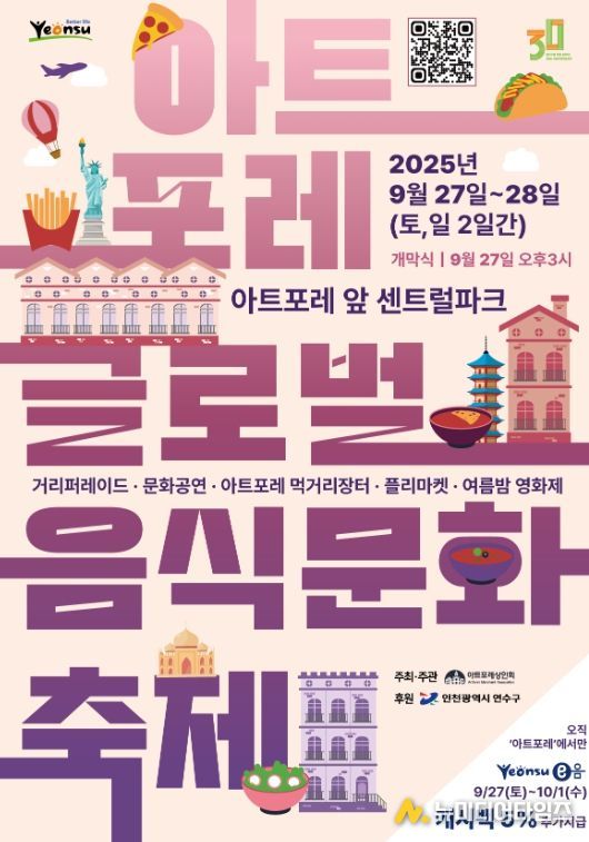 연수구는 오는 27일과 28일 양일간 13시에서 18시까지 ‘아트포레 음식특화거리’와 센트럴파크 일원에서 지역 상권 활성화와 글로벌 음식문화 교류를 위한 ‘제1회 아트포레 글로벌 음식문화축제’를 개최한다.