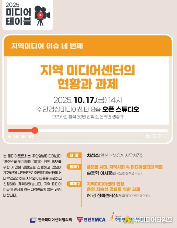 인천 미추홀구 주안영상미디어센터는 오는 10월 17일 오후 2시 센터 오픈 스튜디오에서 ‘미디어 테이블: 지역 미디어센터의 현황과 과제’ 토론회를 개최한다.