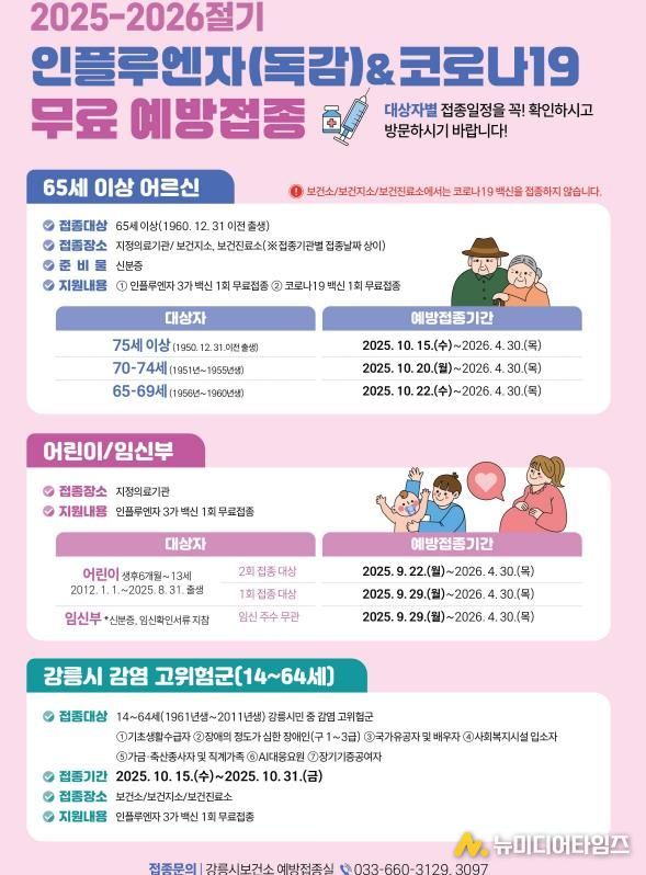 강릉시는 겨울철 호흡기 감염병 예방을 위해 오는 9월 22일부터 2025-2026절기 독감 및 코로나19 무료 예방접종을 실시한다고 밝혔다.
