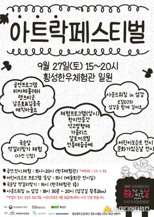 횡성문화관광재단은 ‘2025 문화가있는날-아트락페스티벌’을 오는 9월 27일 오후 3시부터 8시까지 횡성한우체험관 일원에서 개최한다고 밝혔다.