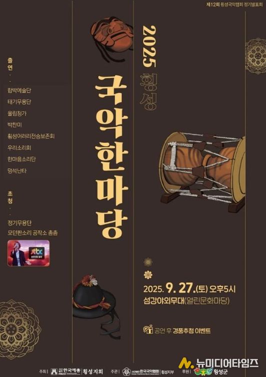 횡성군의 가을밤을 전통의 울림으로 수놓을 '2025 횡성 국악한마당'이 오는 9월 27일 오후 5시, 섬강야외무대(열린문화마당)에서 열린다.