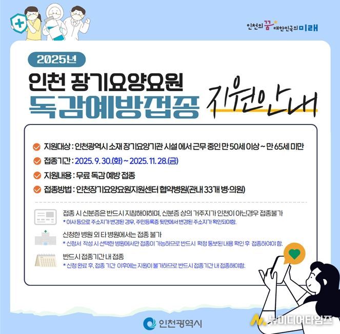 인천광역시는 노인 감염취약시설인 장기요양기관 종사자 1만여 명의 건강권 확보와 처우 개선을 위해 오는 9월 30일부터 11월 28일까지 약 9주간 무료 독감 예방접종을 실시한다고 밝혔다.