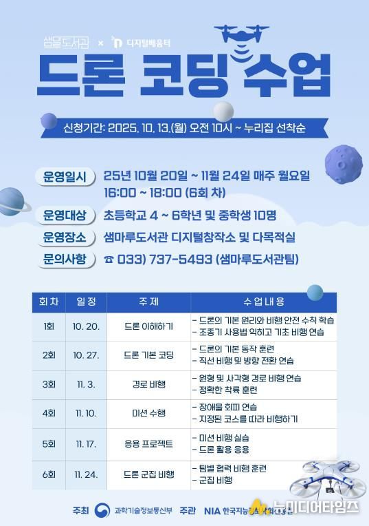 원주시 샘마루도서관은 과학기술정보통신부가 주최하고 한국지능 정보사회진흥원에서 주관하는 ‘디지털 역량 강화 교육: 드론 코딩 수업’을 10월 20일부터 11월 24일까지 운영한다.